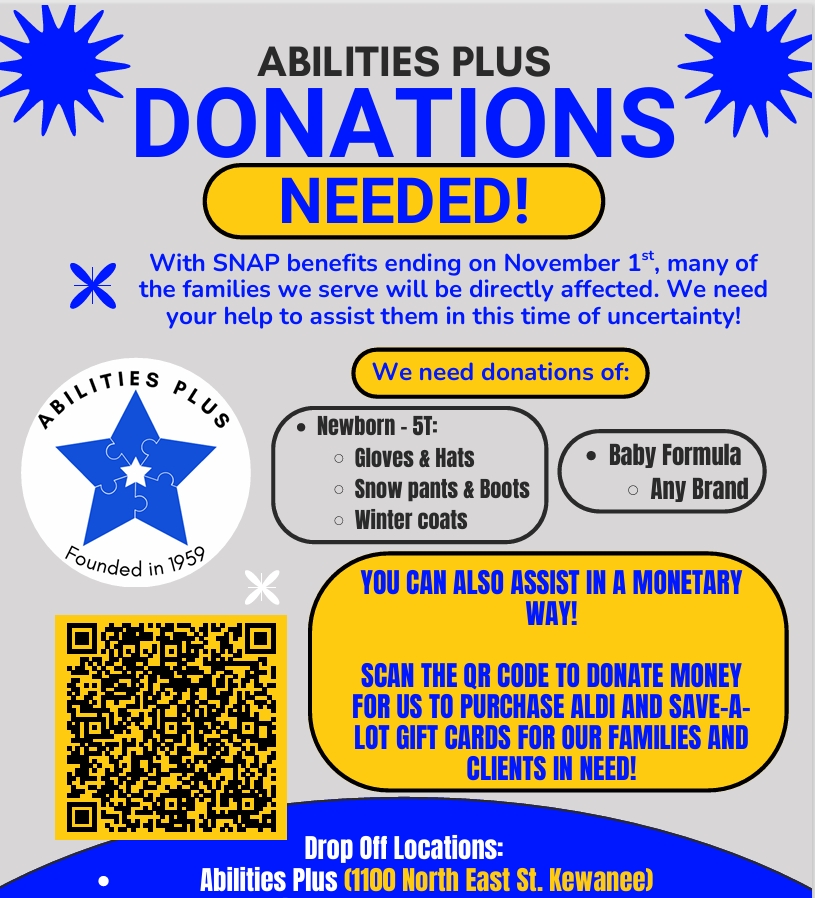 Kewanee, Ill.–Abilities Plus is launching a campaign to support our clients and their families who are experiencing hardships due to recent reductions in Supplemental Nutrition Assistance Program (SNAP) benefits.
