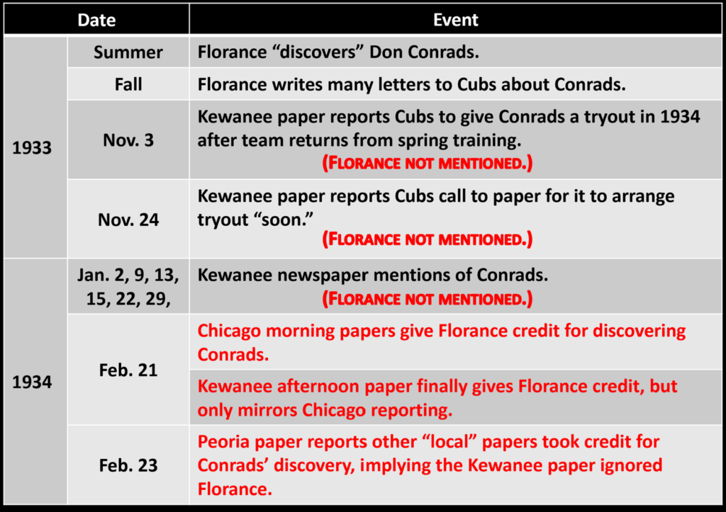 Today I finally put together a timeline of newspaper stories about Florance discovering Don Conrads and arranging for a spring training tryout with the Cubs.