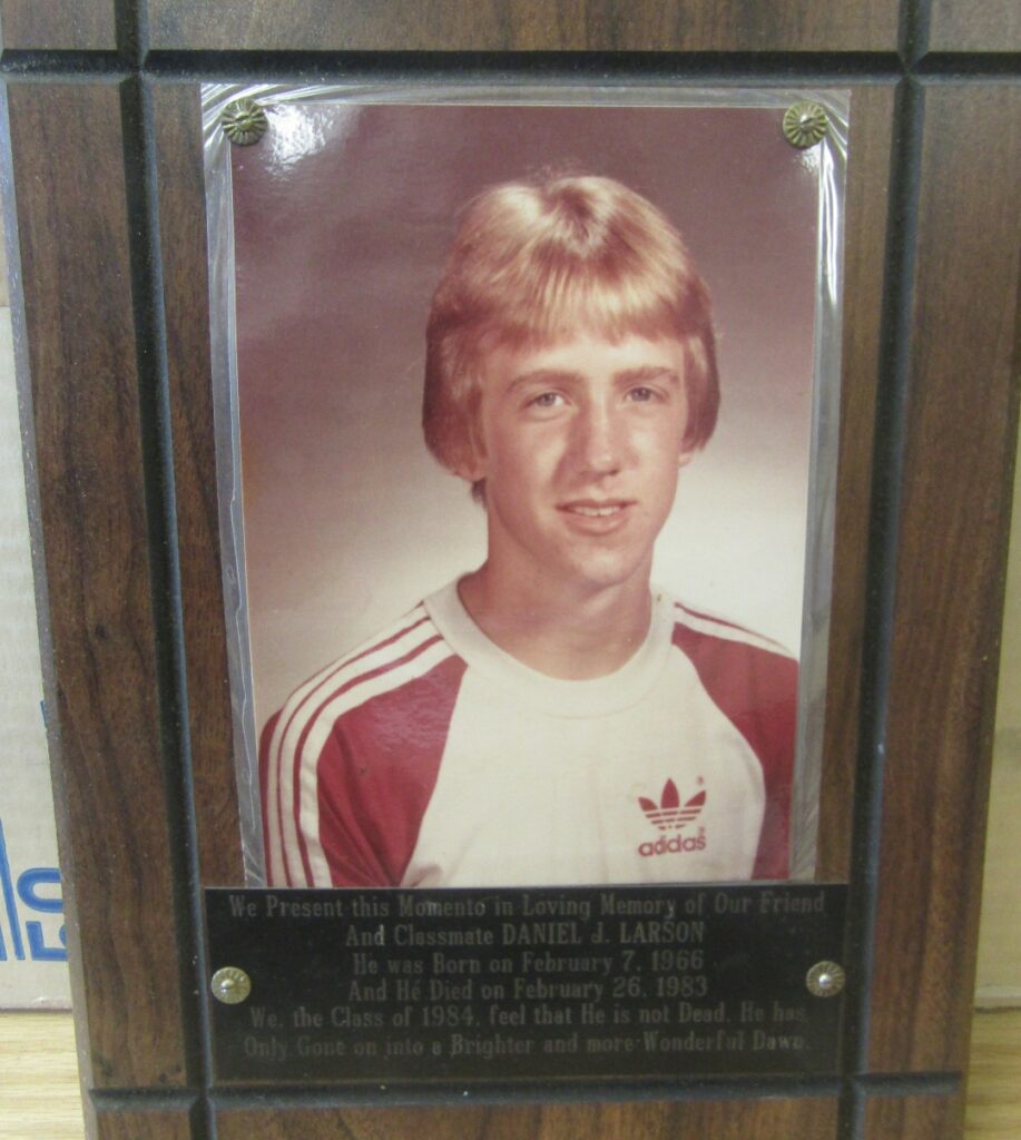 One of the first “finds” was a memorial plaque with a color photo of a student named Daniel Larson. No one knew who he was but the plaque was presented by the Class of 1984 “In Loving Memory” of their classmate.