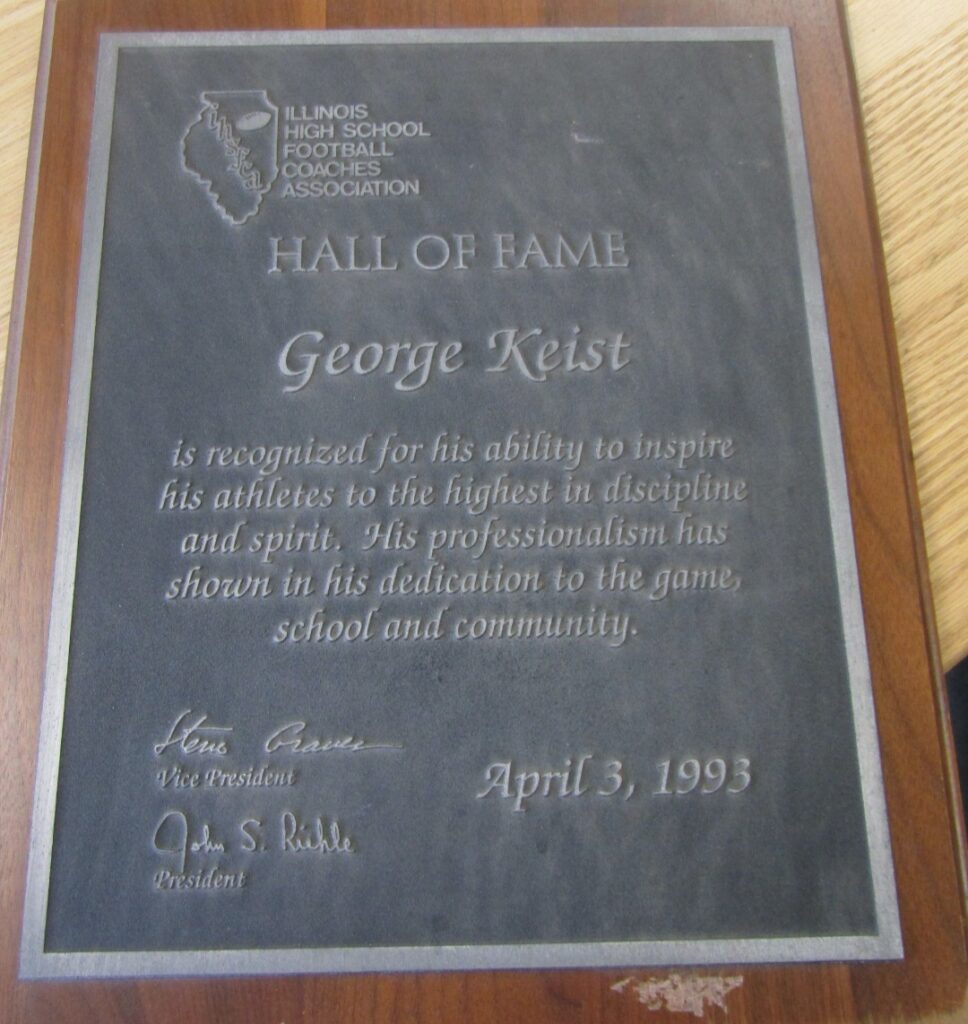 The Hall of Fame plaque reads George Keist “is recognized for his ability to inspire his athletes to the highest in discipline and spirit. His professionalism has shown in his dedication to the game, school and community.”