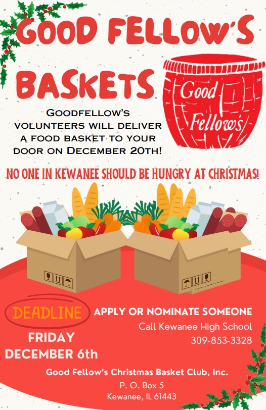 The deadline for the basket nominations and applications is Friday, Dec. 6. To apply or nominate someone, contact the Kewanee High School at (309) 853-3328.