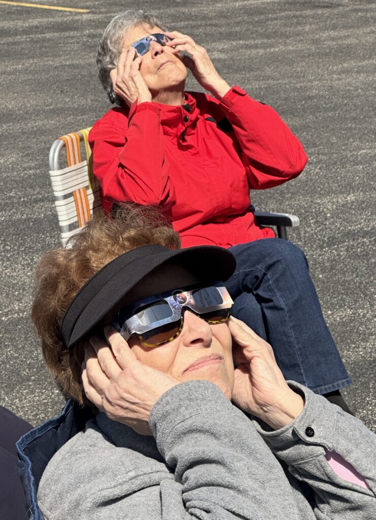 Jean Kelly (top, red) and Susan Curtis (bottom) watch the eclipse with friends at the Kewanee United Methodist Church. [Photo courtesy of Dave Kooi]