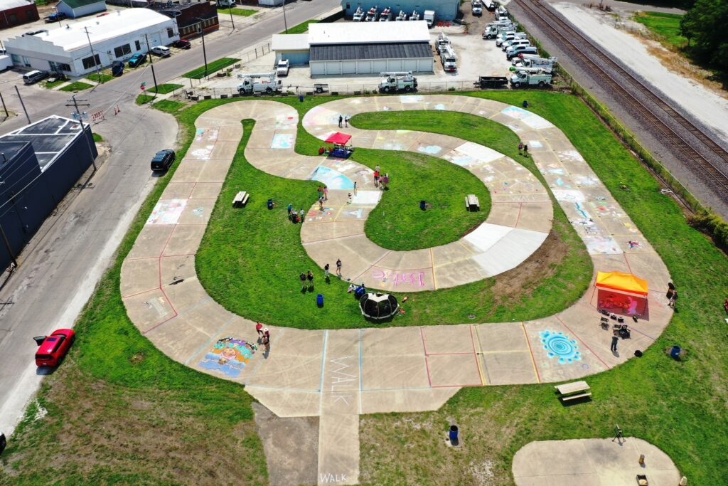 An aerial view of the former go-kart track which will once again host the chalk art competition during the Prairie Chicken Arts Festival. [Prairie Chicken Arts Festival photo]