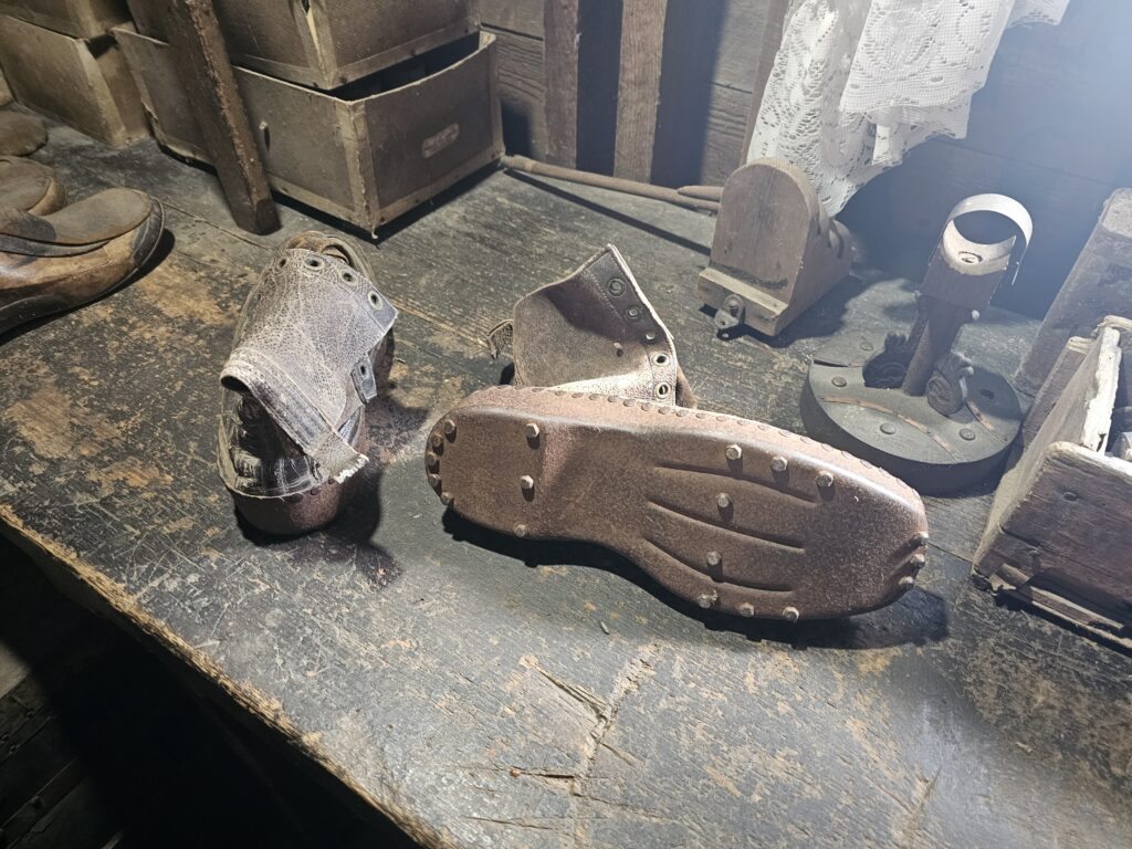 While Fred walked around barefoot much of the time, he did wear shoes into the city. Concerned with cleanliness, Fred crafted his own shoes with steel bottoms. Those shoes can be seen in his workshop, along with snowshoes and a toolbox he built.