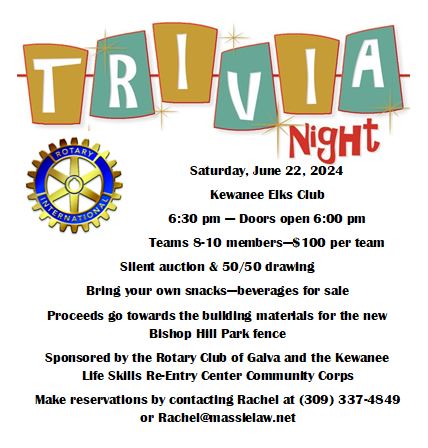 The Rotary Club of Galva will be hosting a Trivia Night this Saturday, June 22, at the Kewanee Elks Lodge to raise funds for the materials to build a new fence for the Bishop Hill Park. The doors will open at 6 p.m. with the trivia starting at 6:30 p.m.