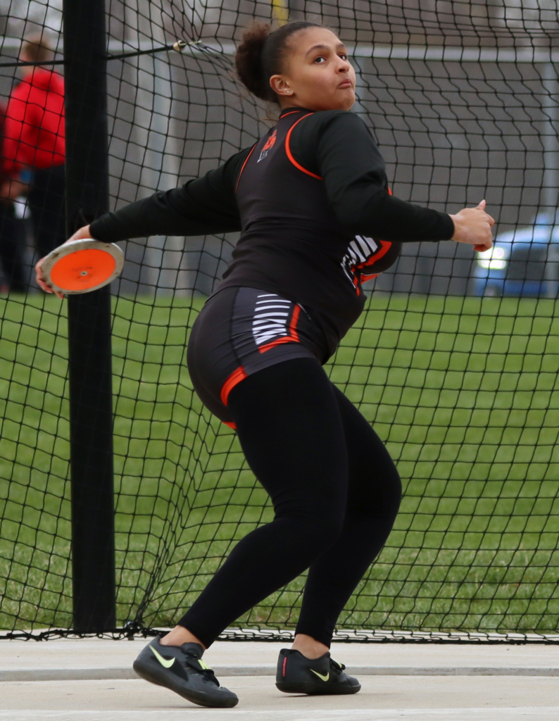 Ra’Kiya Amos hurls the discus. [Photo by KHS student Itzel Mosso Ramos]