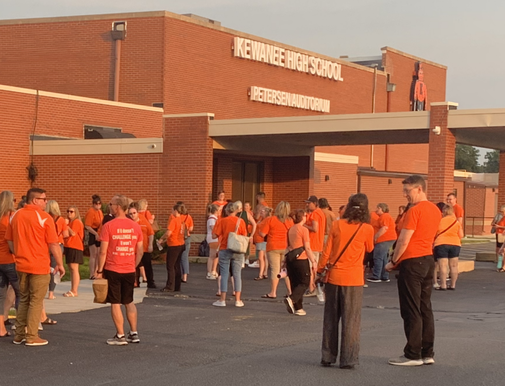 Members of the Kewanee Education Association and their supporters turned out in orange at the Kewanee School Board meeting on Aug. 21. [Photo by Mike Berry]