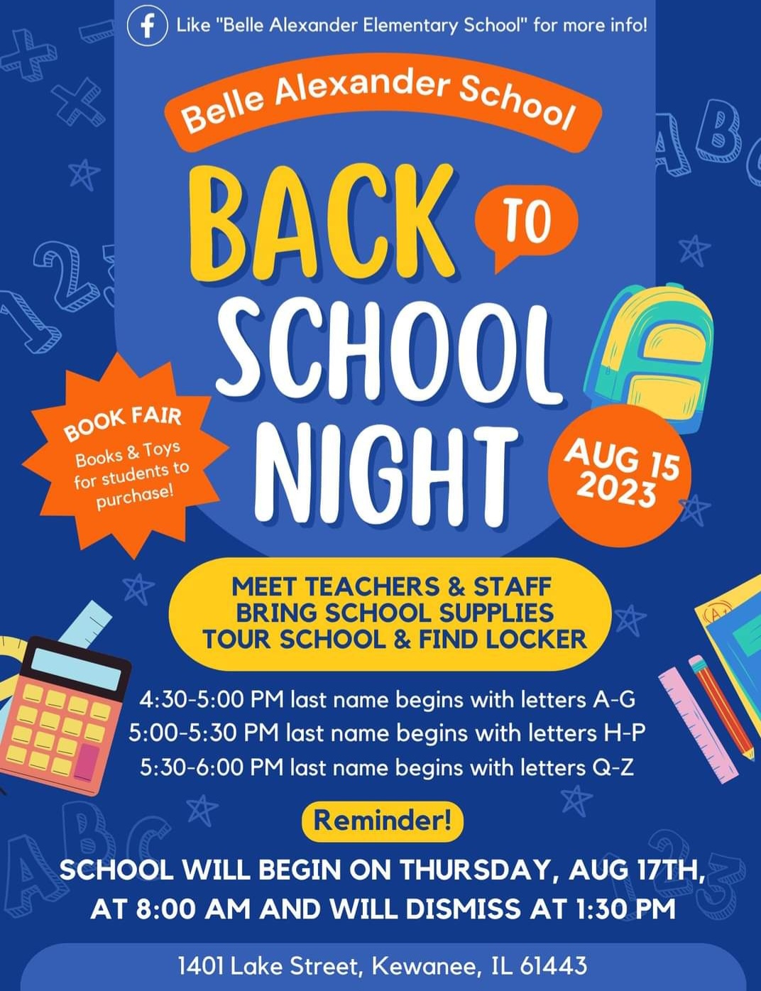 Belle Alexander School, at 1401 Lake St., is holding a “Back to School Night” on Aug. 15. The event is scheduled from 4:30 pm to 6 pm. Students with a last name beginning with A-G are invited to attend from 4:30 to 5 pm. Students with the last name beginning with H- P should plan… Continue reading Belle Alexander School holds Back to School Night