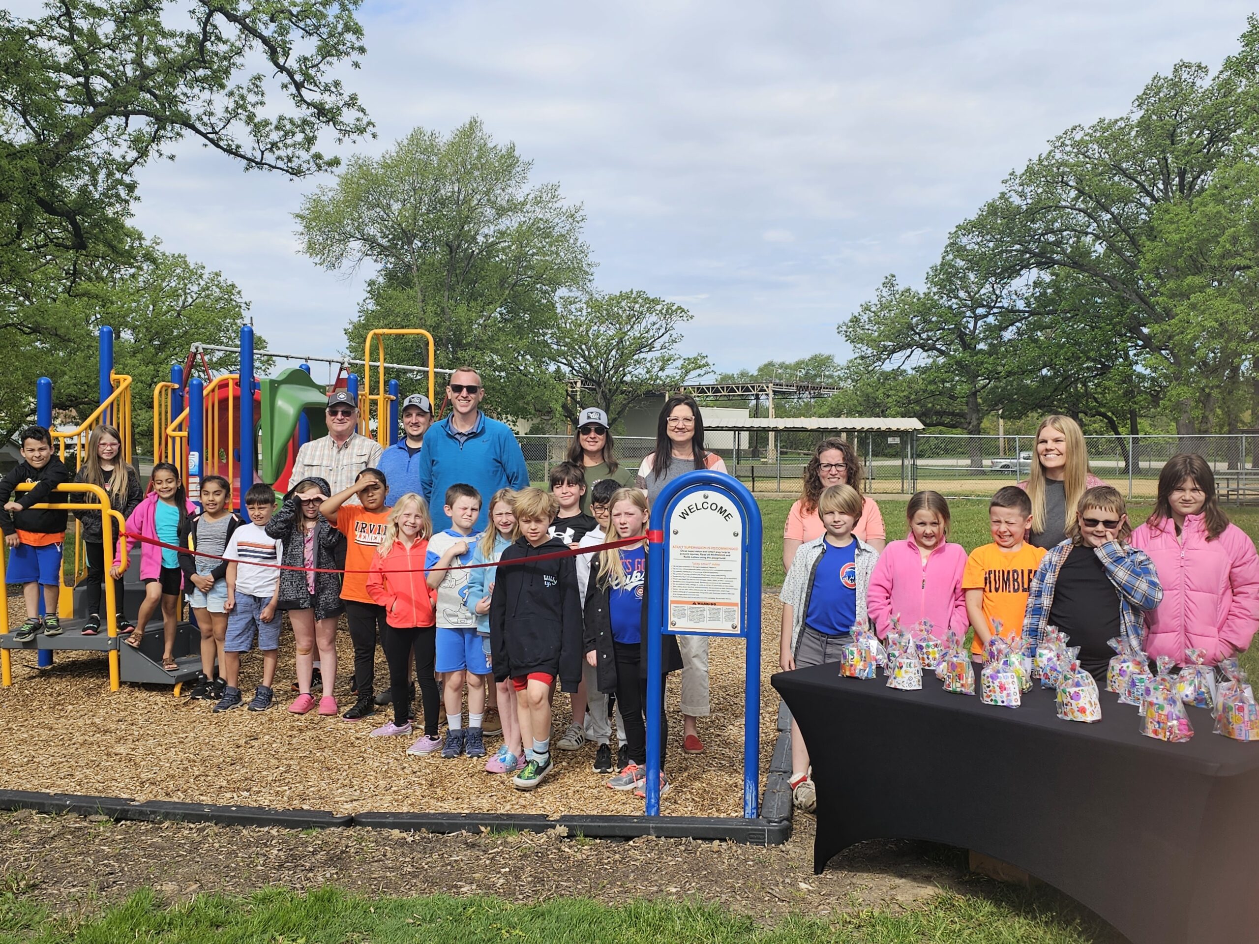 Students from Mrs. Gerard’s second-grade Irving class helped park district employees and officials celebrate the grand opening of Chautauqua Park’s new playground equipment on Tuesday. The students lined up around 9:30 am in front of the red ribbon and the gift bag table for a group photo before becoming the very first kids to try… Continue reading Students and Park District officials cut the ribbon on a new playground
