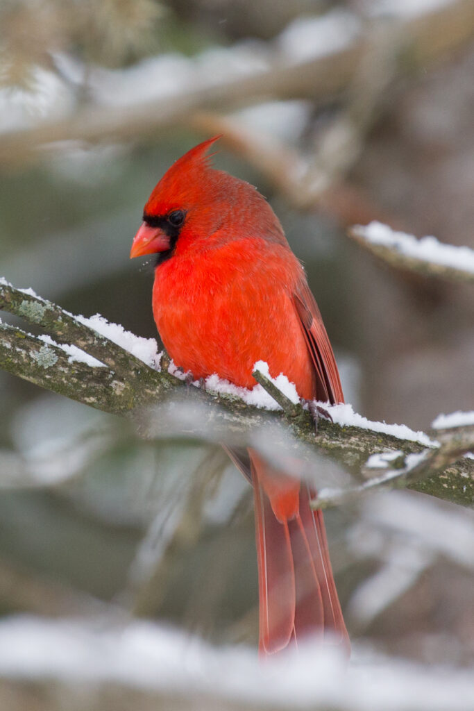 Northern cardinal, male, photographed in the author’s yard in Kewanee (January 2020). Cardinals captivated the author when she moved to Illinois as a child. [Photo by Jill Bartelt]