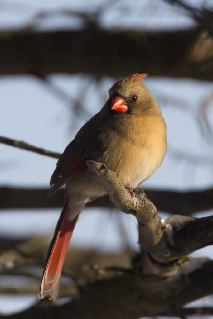 Northern cardinal, female, photographed in the author’s yard (February 2021). This January, a pair of cardinals frequently visit the author’s bird feeder just before dusk. [Photo by Jill Bartelt]
