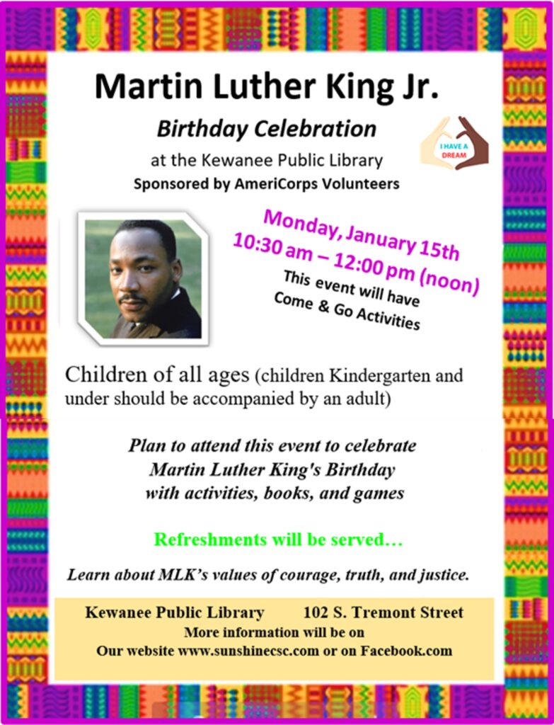 The Kewanee Public Library, located at 102 S. Tremont St., is hosting a Martin Luther King Jr. Birthday Celebration in honor of the Baptist minister and social activist who led the civil rights movement in the United States from the mid-1950s throughout most of the 1960s.