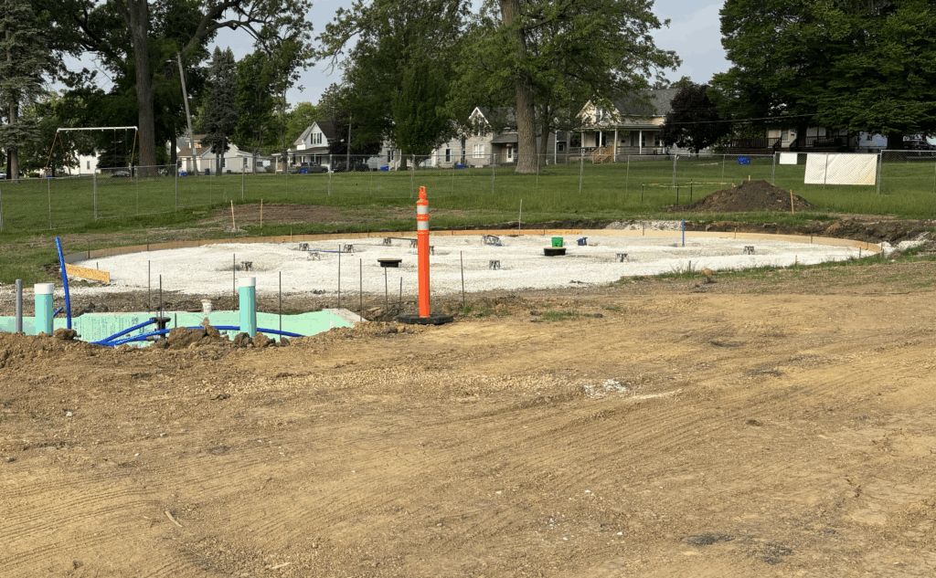 Work is proceeding on the new splash pad in Liberty Park. [Photo by Michael Berry]