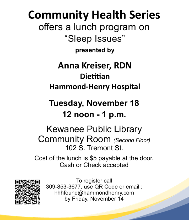 The public is invited to attend a Community Health Series event. The informative and engaging lunch program is set for Tuesday, Nov. 18, from noon to 1 p.m. on the second floor in the Kewanee Public Library, located at 102 S. Tremont St.