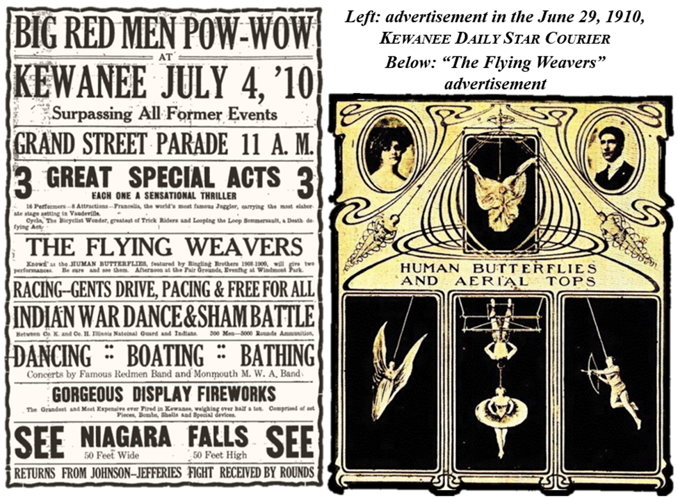 The afternoon program included races, bicycle riding; ring and trapeze work; juggling of heavy weights, loop the loop without a loop; and a sham battle. Music was furnished by the Redmen Band. In particular, The Flying Weavers were well received with their tumbling, ring and trapeze skills, along with a “butterfly dance” where a woman hung by her teeth.