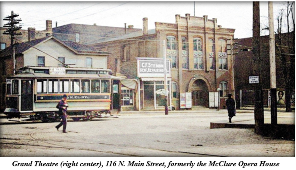 The Grand Theatre had opened its doors only a month earlier, on June 6. The building, constructed in 1899, had previously housed a venue simply called the Opera House, followed by the McClure Opera House and then the Kewanee Opera House. When Frank Thielen of Aurora and Willard J. West of Kewanee became the managers of the opera house, they completely overhauled the building and accoutrements, with the intent of offering vaudeville and “moving pictures.” Improvements included frescos painted on walls, cork matting laid down on the aisles and stairways, new “art” doors installed, and a new stage floor laid. The Grand’s opening night’s entertainment included four different moving pictures, a troupe of bicyclists, a singing trio, and a lady impersonator.