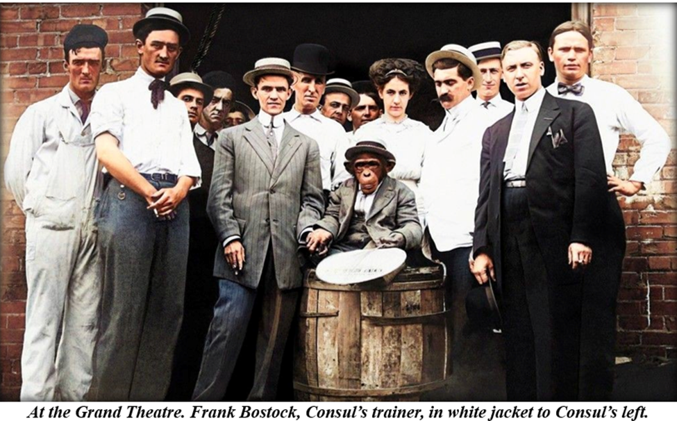 Frank Bostock was a famed third-generation animal trainer and menagerist. But Consul was his greatest money maker. The original Consul was trained in England but died at the turn of the century. Another chimpanzee was trained to take his place, coming to America in 1910. Consul is often credited as the first performing chimpanzee, and others followed in his footsteps. One of the Consuls appeared in a movie short chronicling his trip across the Atlantic. After the original Consul died, the story goes that Bostock replaced him with multiple Consuls so Bostock could arrange multiple tours.