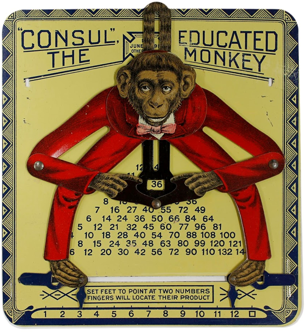 In 1915, an industrious inventor, William Henry Robertson, used Consul’s fame for the name of a novelty calculating device/toy, a number chart combined an object resembling and representing Consul, which was adjustable in relation to the chart, and which could perform computations, thereby suggesting the idea that Consul could perform addition and multiplication. The U. S. Patent Office issued patents for a toy and for calculating.