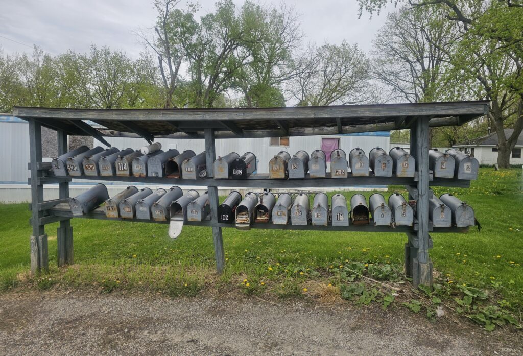 Empty mailboxes stand in front of Southwind Mobile Home Estates. The trailer park has been at the center of litigation between the remaining tenants of the park and the city of Kewanee. [Photo by Susan DeVilder]