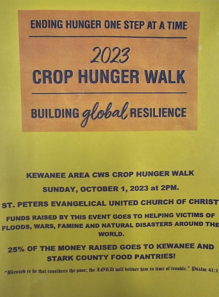 The 2023 Kewanee Area CWS Crop Hunger Walk will be held Sunday, Oct. 1 at 2 pm at the St. Peters Evangelical United Church of Christ. Funds raised by the event will go towards helping victims of floods, wars, famine and natural disasters around the world. A quarter of the money raised will go to the Kewanee and Stark County Food Pantries to help end hunger at home.