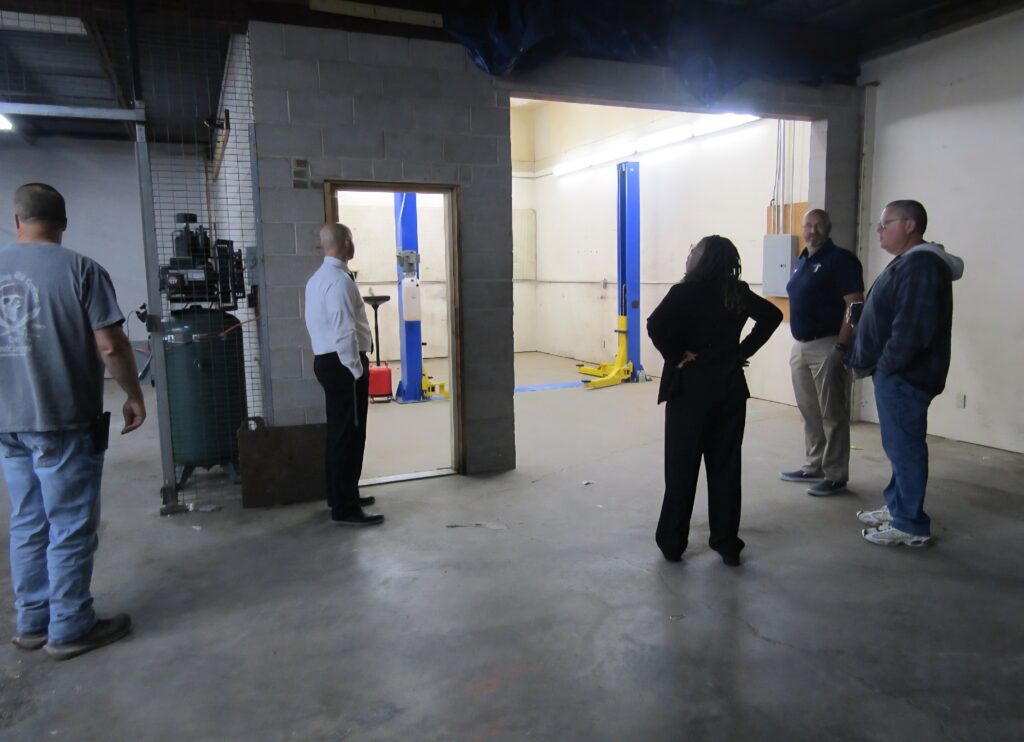In October, board members and administrators look over the automotive bay during a tour. The new building also came with an industrial-sized air compressor, on the left. [Photo by Dave Clarke]