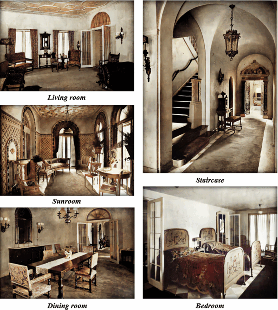 Particular attention was paid to simple elegance without ornate fixtures on the interior. According to a 1919 article published in the magazine, The Architectural Record, earlier styles of heavy paneling and strong, detailed carving gave way to “broad surfaces of plaster, enriched only by an occasional tapestry or heavily carved mirror in old gilt, and crowned by groined arches or coffered ceilings. Mantels and occasional doorways of carved stone, gates, lanterns and sconces of metal, floors of tile, and heavily carved but sparing furniture carry out the effect.” The Bakers exemplified the trend with “their plain walls, rich plaster ceilings, and dependence almost entirely on the carved or painted furniture for their success.”