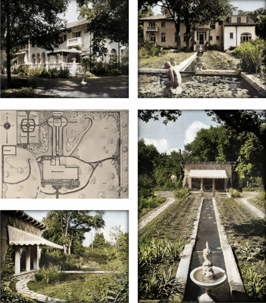 Some large trees were left near the house to give it “the required air of age and unbalanced harmony that new gardens often lack. The figure embodied into the pool is an example of fitness in garden statuary.”