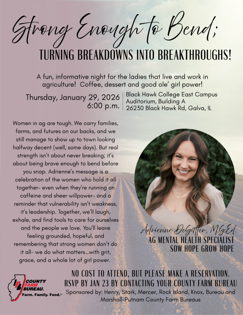 There is no cost to attend, but organizers are requesting that those who plan to attend make their reservations by Friday, Jan. 23. To reserve your spot, contact the Henry County Farm Bureau at 309-937-2411 or email manager@henrycofarmbureau.org.