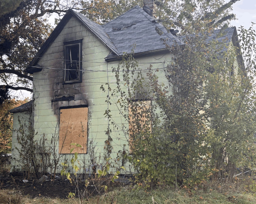 A fire early Saturday morning destroyed this vacant house at Lake Street and Ladd Avenue. [Photo by Michael Berry]