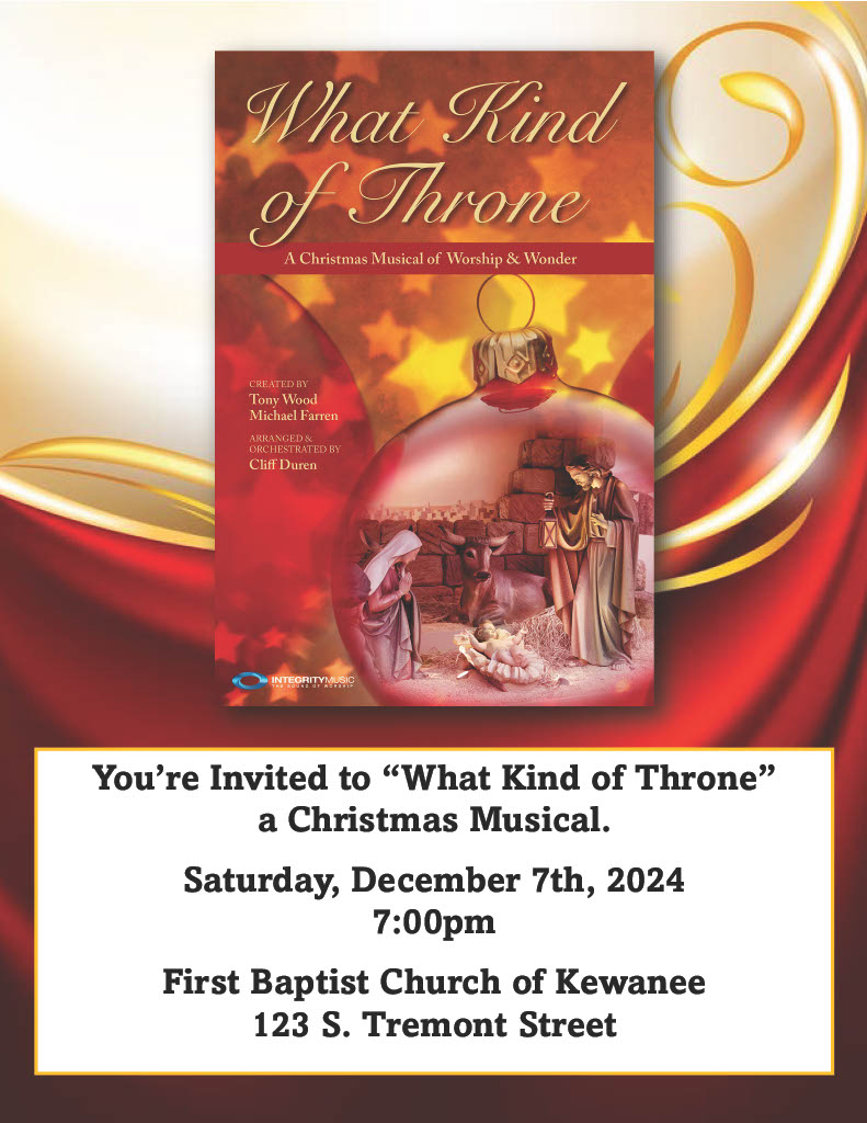 The First Baptist Church of Kewanee, located at 123 S. Tremont St., will present a Christmas musical, “What kind of Throne.”