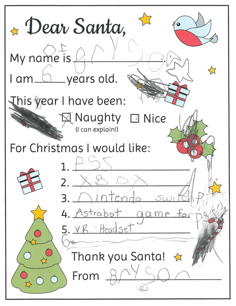 Visitation’s kindergarten class took part in a holiday writing activity, filling out form letters to Santa. Each student listed their top five gift wishes, making for a fun and efficient way to share what they’d like this Christmas.
