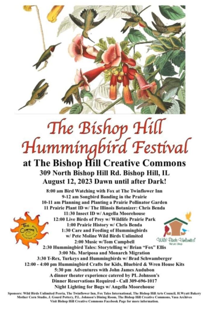 The Bishop Hill Hummingbird Festival at The Bishop Hill Creative Commons, located at 309 North Bishop Hill Rd., is scheduled for Saturday, Aug. 12 from dawn to dusk.