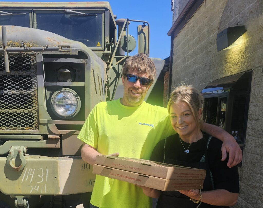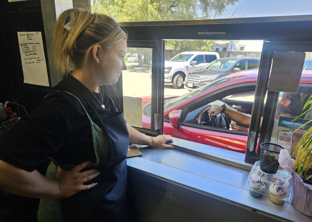 She opened the drive-thru window at 10:45 a.m. and within a half hour, she had given away 32 pizzas, sometimes throwing in a bag of alfredo sauce and bottles of free Happy Joe’s Taco Sauce for good measure.