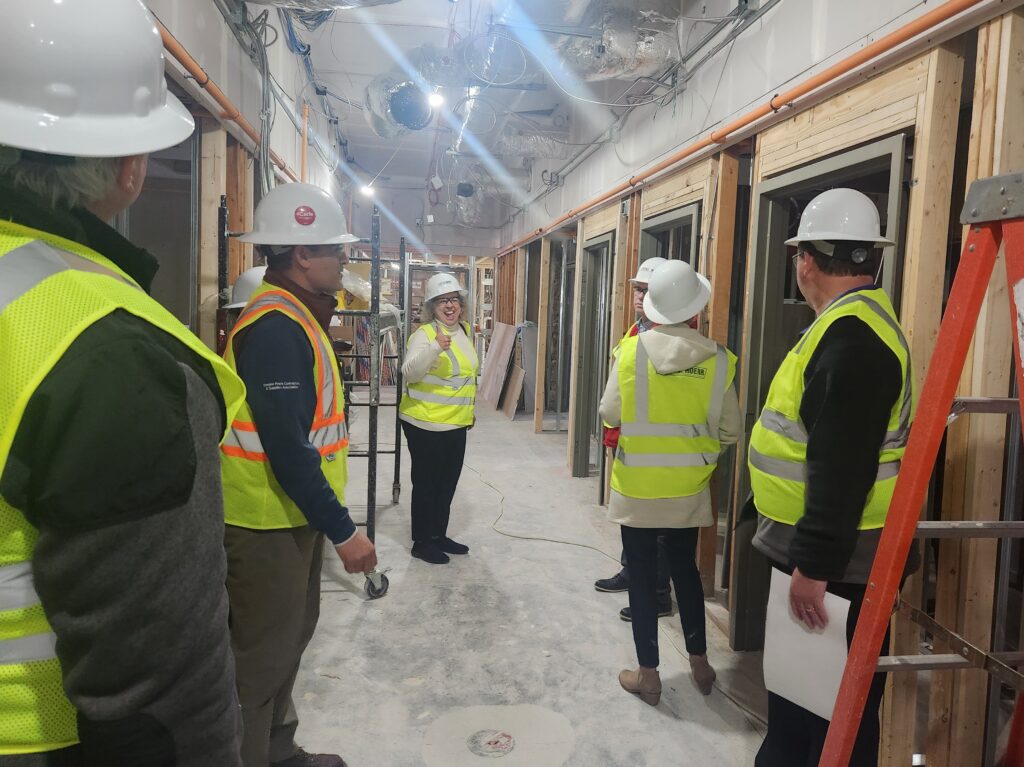 Guided by Val Ramirez, project executive with PJ Hoerr, and outfitted with hard hats and safety gear, the group walked through the developing facility. The shelter will include 10 family suites, each with an ensuite bath, built-in cabinetry, two twin beds and a set of bunk beds. Each room will also have a television to create a more comfortable, private space.