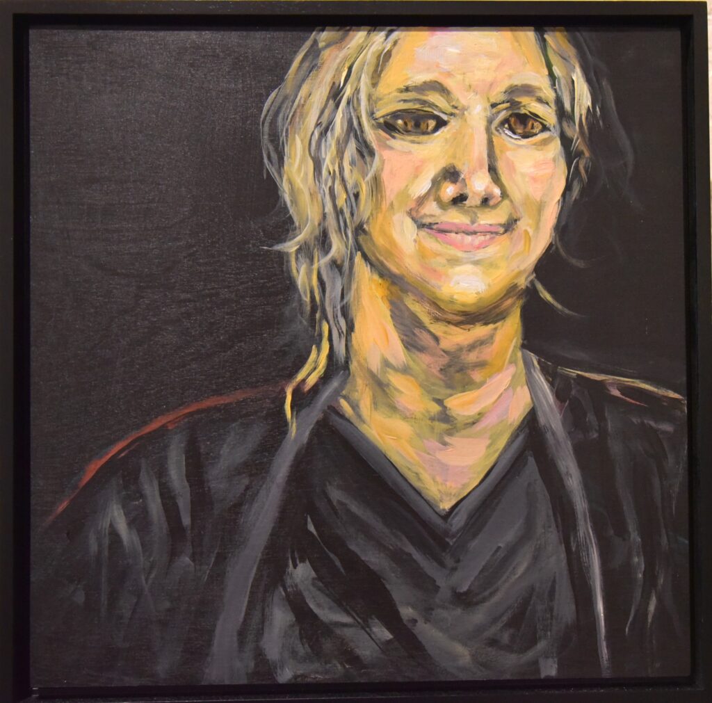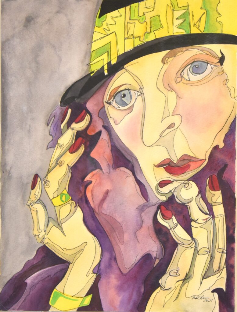 Second place in that category went to watercolorist Nicole (Nikki) Ponce. “Rose” is a striking pen and watercolor portrait, highlighted in shades of purple and yellow. An adjunct professor at Carl Sandburg, she studied art and printmaking at Eastern Illinois University.