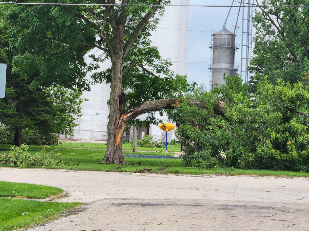 Falling limbs damaged several homes and garages, and some vehicles fell victim to large branches and flying debris. In some instances, entire trees were uprooted – blocking roadways and disrupting traffic. Dumpsters, trampolines and lawn furniture were blown into the street. A large, inflatable coffee cup was pulled from the Old Bank Coffee overhang and made its way into the downtown area where it rolled about until the shop’s owner was able to corral it.