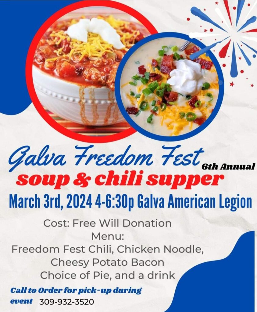 For the sixth year, the Galva Freedom Fest will hold its soup and chili supper. The event will be held at the Galva American Legion on Sunday, March 3 from 4 to 6:30 pm.