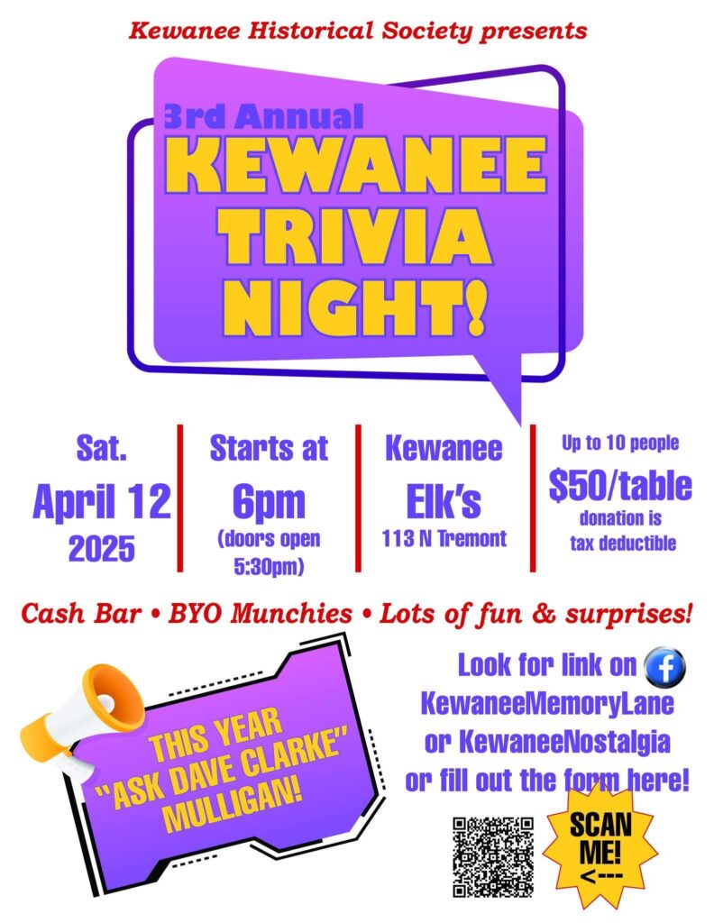 Think you know Kewanee history? Put yourself to the test at the third annual Kewanee Historical Society – Kewanee Trivia Night. This year’s event will be held on Saturday April 12, at 6 p.m. at the Kewanee Elks Club located at 113 N. Tremont St. Doors will open at 5:30 p.m.