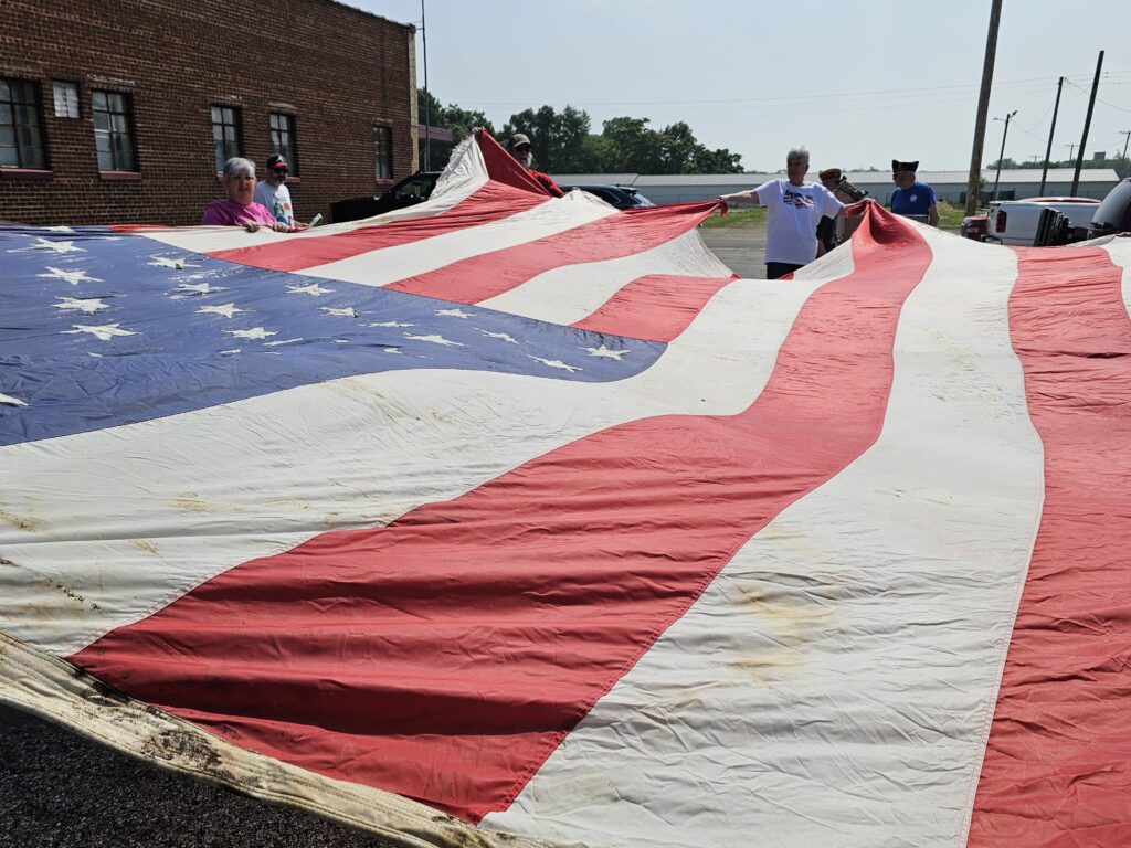 Like last year, the flag that flew over Berrien Park downtown needed to be retired. Frayed and tattered at the edges, the flag was brought to the veterans by the executive director of the Kewanee Chamber of Commerce Mark Mikenas.