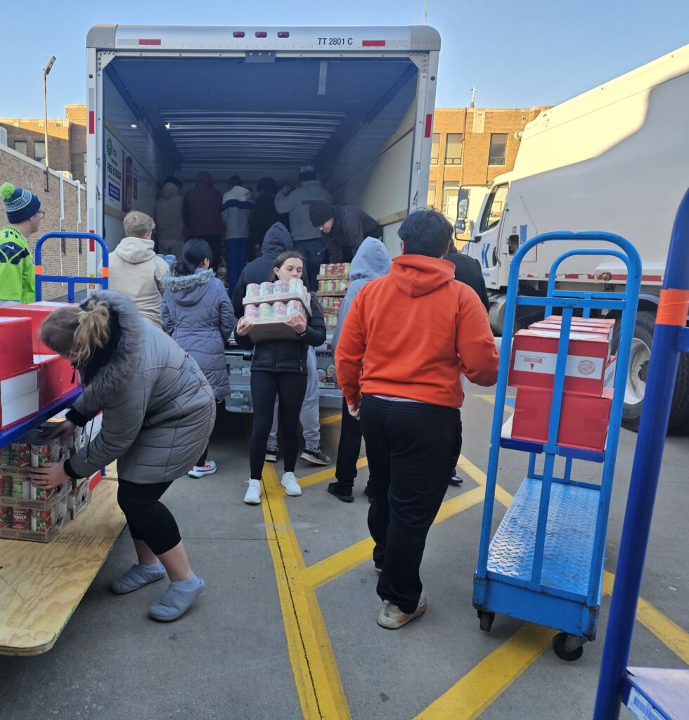 The process will continue on Tuesday with the addition of fruit, potatoes, donated canned goods and boxed dinners. The donated food comes from canned food drives that started back in November at Visitation and Kewanee and Wethersfield schools.