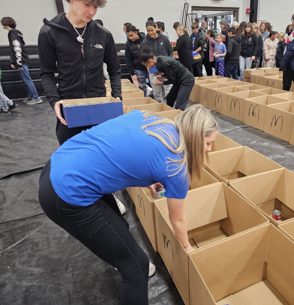 On Monday, operation “filling the boxes” began in earnest at the Central gym. Students from fourth grade to high school assembled and, under the watchful eye of Key Club Advisor Amy Miler, began adding the nonperishable items to the various sized boxes.