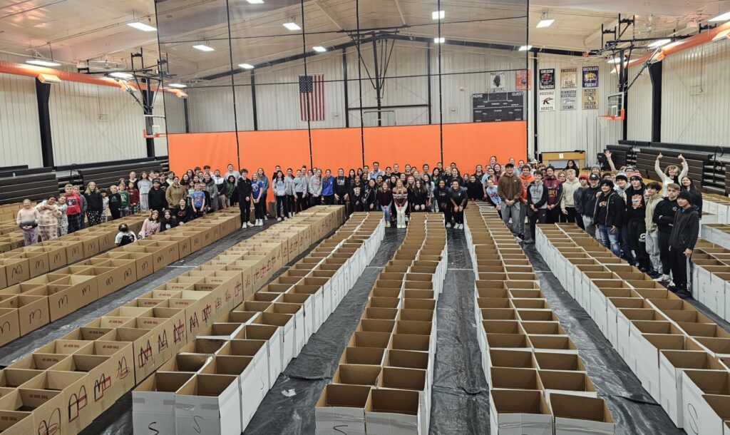 That day, the students added items that don’t require refrigeration and were delivered right to the gym door on trucks from Save-a-lot. Tuna, jelly, peanut butter, spaghetti sauce, spaghetti and paper towels were added to the boxes.