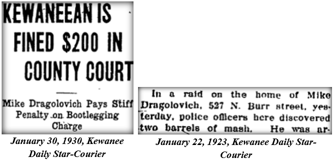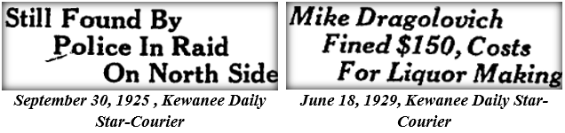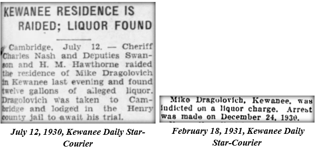 “CAMBRIDGE July 15 [1930] – Mike Dragolovich, whose place was raided last week in Kewanee by Sheriff Nash and deputies pleaded guilty to violating the liquor laws and was fined $200 and costs by Judge Chase Davis of the county court yesterday.”