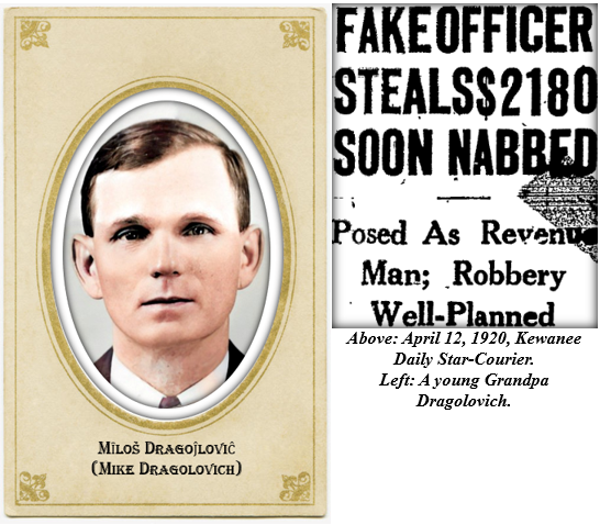 I found one other article which may have involved Grandpa. According to an April 12, 1920, Kewanee Daily Star-Courier article, two men posing as government prohibition officers entered the boarding house at 527 N. Burr St., found and then left with the residents’ money.