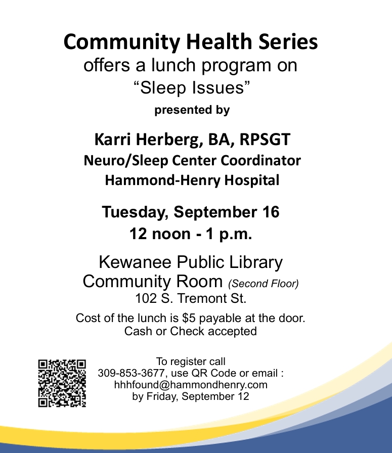 “Sleep Issues” will be presented by Karri Herberg, BA, RPSGT neuro/Sleep Center Coordinator Hammond Henry Hospital. The program will be held at the Kewanee Public Library Community Room located on the second floor and will be from noon – 1 p.m.