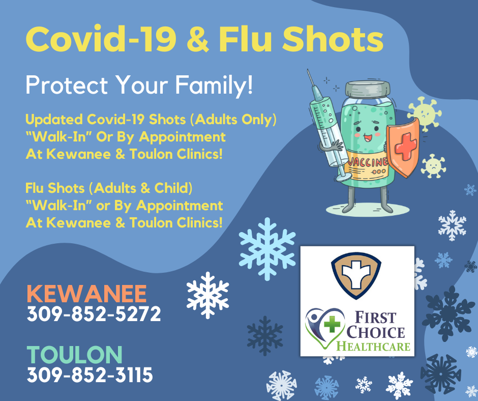 The Health Departments are reminding local residents they have seasonal flu shots for all adults and children – 6months and older, as well as Pfizer Updated Adult Covid-19 shots at their clinics in Kewanee and Toulon on a “walk-in basis” and by appointment while supplies last.