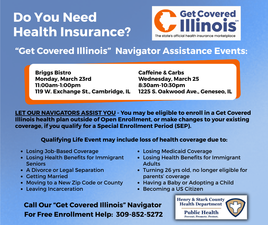 The Henry and Stark County Health Departments and the Get Covered Illinois Navigator Program asks, “Do You Need Health Insurance?” Their Health Insurance Navigators will be present at the upcoming local events to assist anyone looking to set up health insurance coverage: