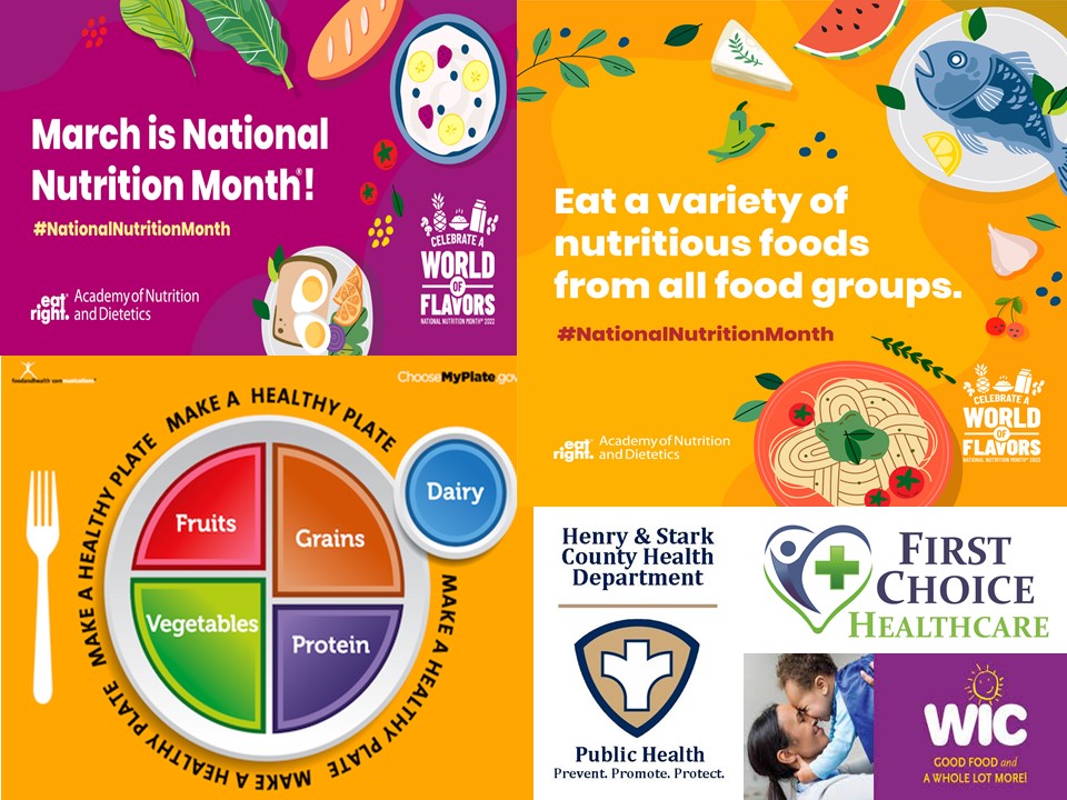 The Henry and Stark County Health Departments are announcing that March is National Nutrition Month. Whether it’s starting the day off right with a healthy breakfast or fueling before an athletic event, the foods you choose can make a real difference. Preparing your food to go further by planning meals and snacks in advance can also help reduce food loss and waste.