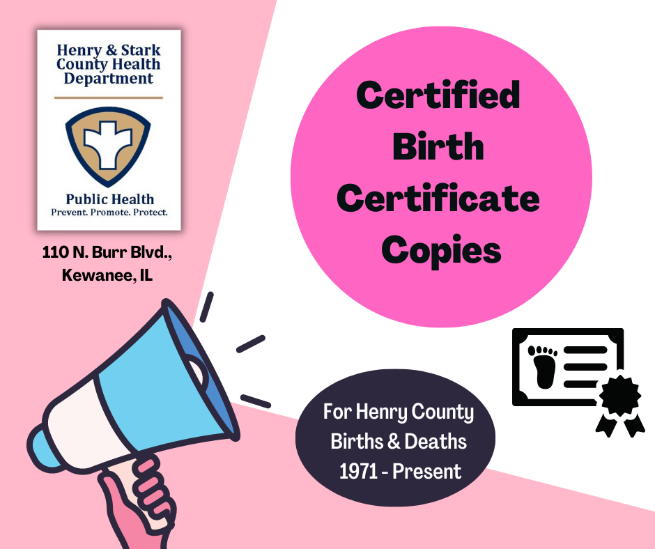 The Henry County Health Department is the place for area parents to obtain certified copies of birth certificates for children born in Henry County since 1971. The office is located at 110 N. Burr Blvd in Kewanee. In addition, certified death certificates since 1971 are also available through their office.