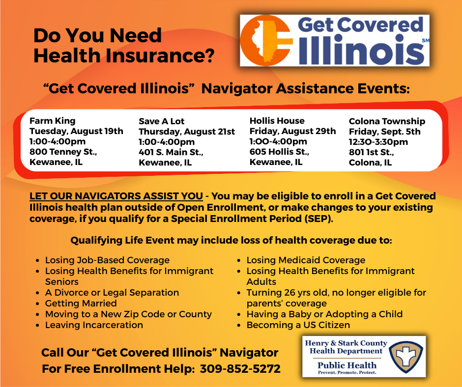 The Henry and Stark County Health Departments and the Get Covered Illinois Navigator Program asks, “Do You Need Health Insurance?” Their Health Insurance Navigators will be present at some upcoming local events to assist anyone looking to set up health insurance coverage: